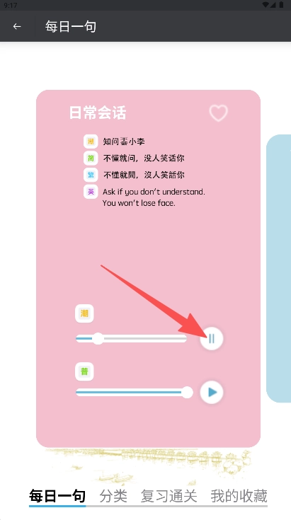 2、选择“日常会话”这一分类,点击播放按钮来听取潮语的发音。