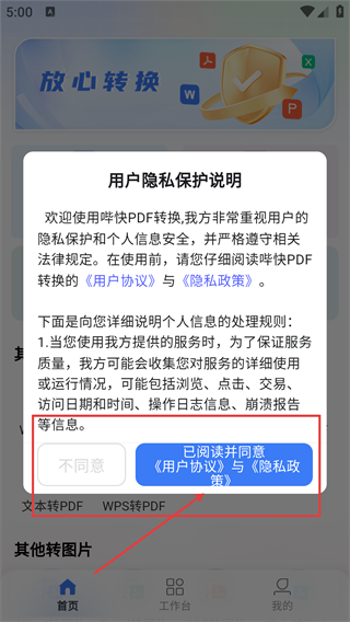 1、进入应用后,需阅读【用户隐私保护说明】,包含《用户协议》《隐私政策》内容,点击【已阅读并同意】按钮即可进入应用。
