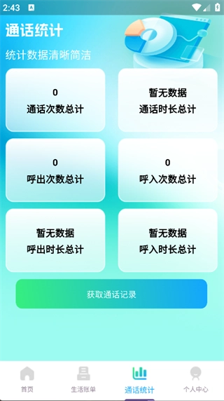 4. 点击页面下方的‘通话统计’,即可看到通话次数总计、呼出次数总计等数据。