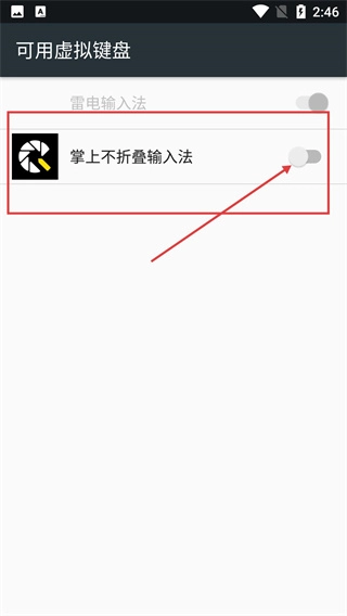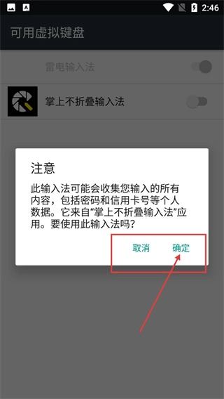 3、进入“可用虚拟键盘”页面后,开启“掌上不折叠输入法”的开关,此时会弹出权限确认的提示窗口。