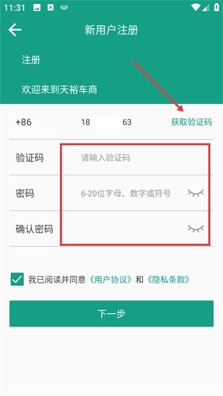 3、点击【获取验证码】按钮,输入收到的验证码,设置新密码并再次确认密码,同时勾选同意相关协议。