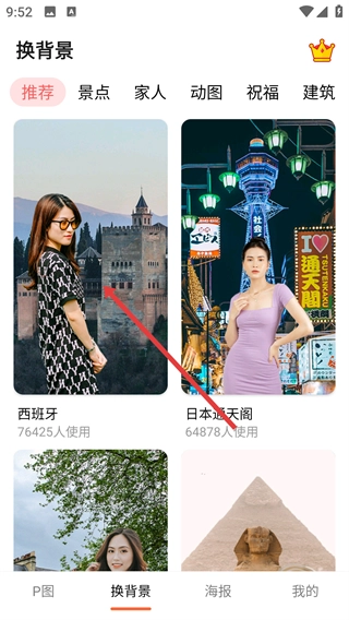 1、进入换背景页面,在【推荐】【景点】等分类中选择心仪背景,如【西班牙】背景,开启图片制作流程。