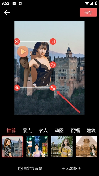 4、导入人像照后,调整其大小和位置,完成后点击【保存】,即可生成换背景后的图片。