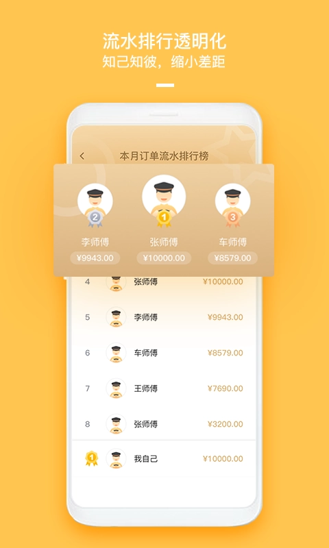 3、排行榜功能展示司机本月接单流水情况,便于了解业绩对比,激励提升收入。