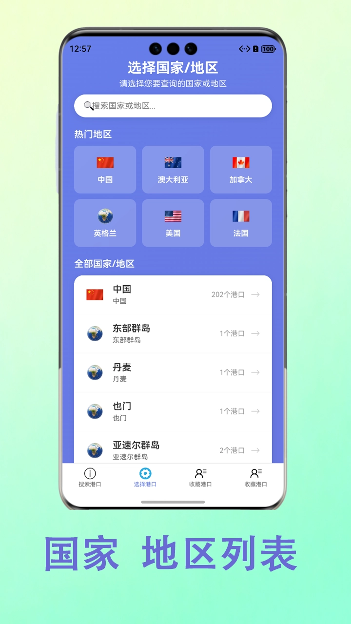 3、可依据不同国家和地区查询对应的港口,使用手机查看会更便捷。