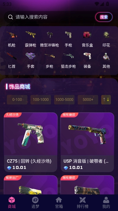 YOYO藏宝阁是安全可靠的csgo游戏饰品交易平台,平台上有武器皮肤、刀具、手套等丰富的游戏饰品。你可以通过价格、磨损度、类型等多种条件筛选心仪的饰品,找到后能实时查看该饰品的市场价格、销量及详细属性,再根据自己的喜好和需求进行购买即可。