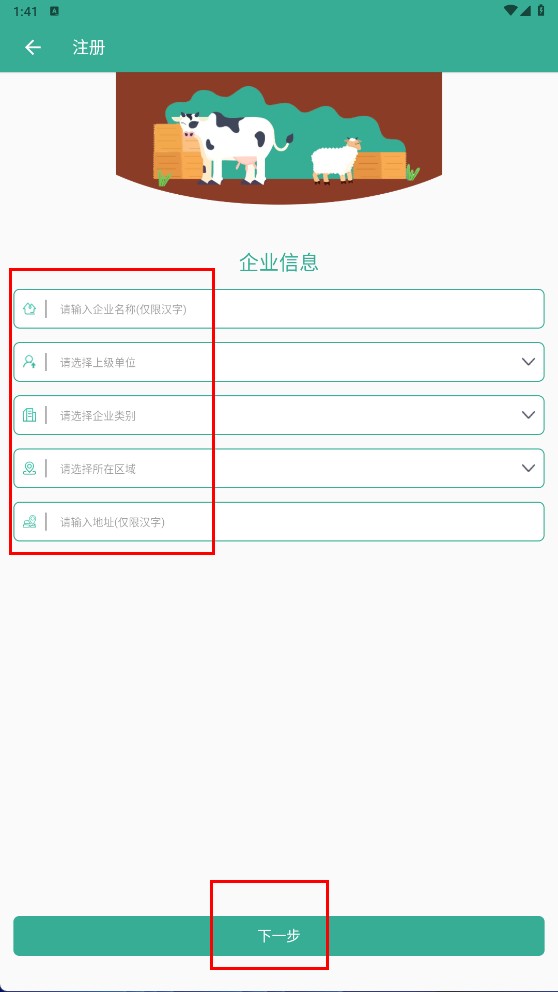 4、接着填写企业信息(企业名称、上级单位、企业类别、所在区域、地址)后点击【下一步】,完成注册流程。
