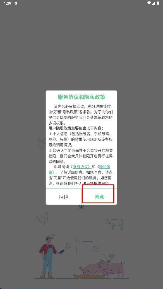1、在服务协议和隐私政策界面,点击【同意】,进入登录或注册环节。