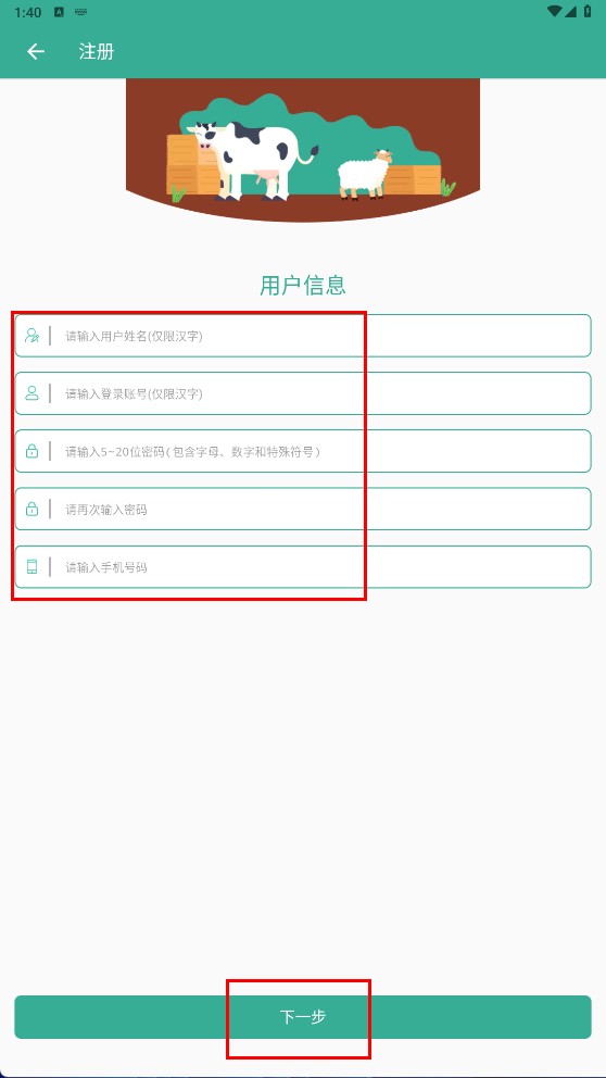 3、注册时,先填写用户信息(用户姓名、登录账号、密码、手机号码)后点击【下一步】。