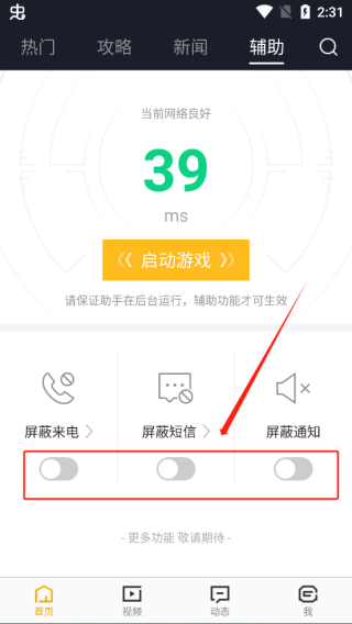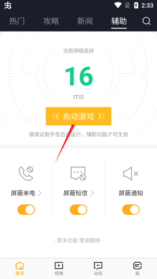 5、即可开启屏蔽来电、短信、通知的功能,点击启动游戏即可