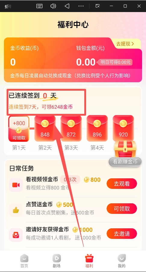 每天进入 “福利” 中心,完成 “签到” 和所有 “日常任务” (看视频、点赞等)。