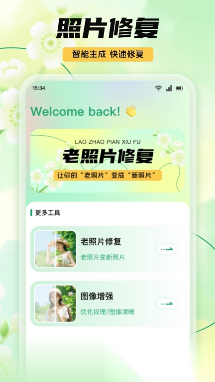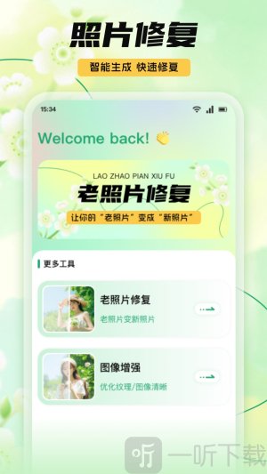 1)点击智能修复功能键,系统便会自动为您修复照片的多处瑕疵,适用范围涵盖老照片、网络照片以及低像素照片等。