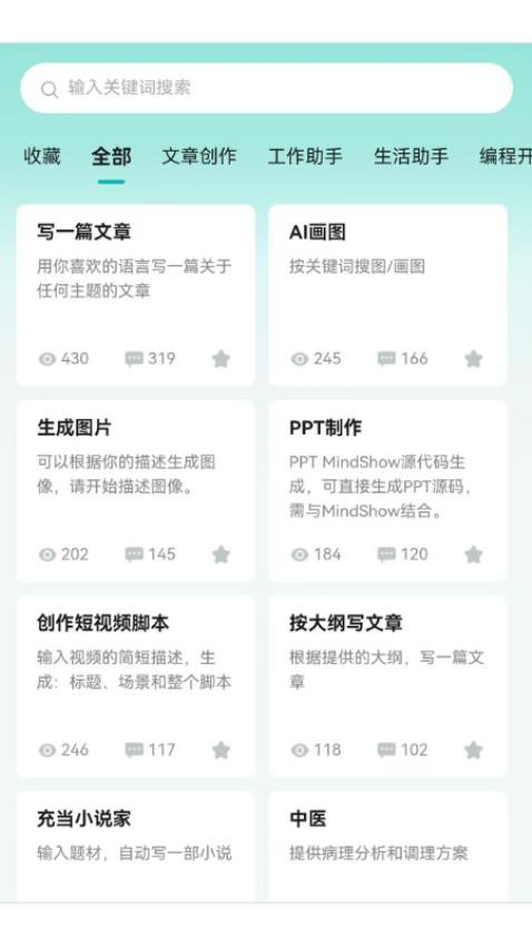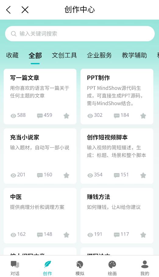 3、借助创作中心,能够体验文章生成、代码编写等AI辅助创作功能。