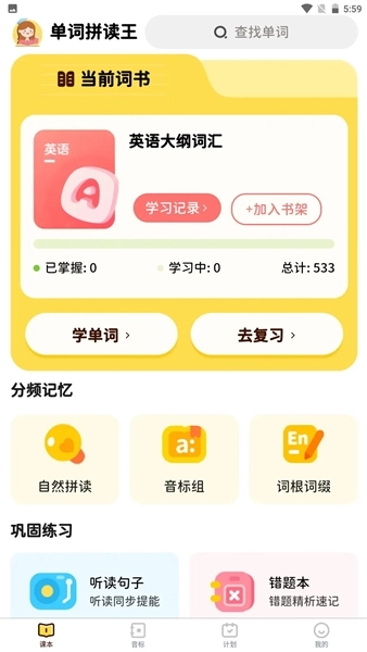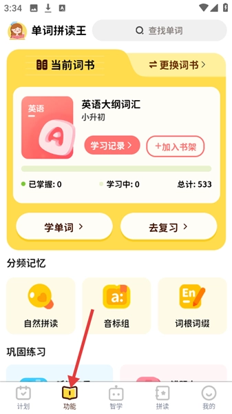 2、切换至【功能】页面,既能开展单词学习,也能借助自然拼读、音标组等分区记忆功能。