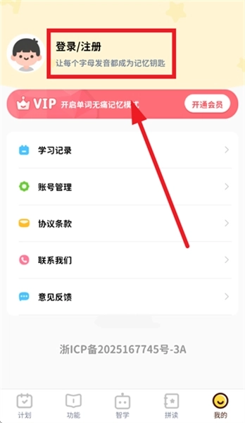 1、先安装单词拼读王并打开它,进入“我的”界面后,点击登录/注册按钮。