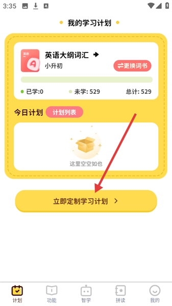 1、进入【计划】页面,点击【立即定制学习计划】按钮,即可完成英语学习计划的定制。