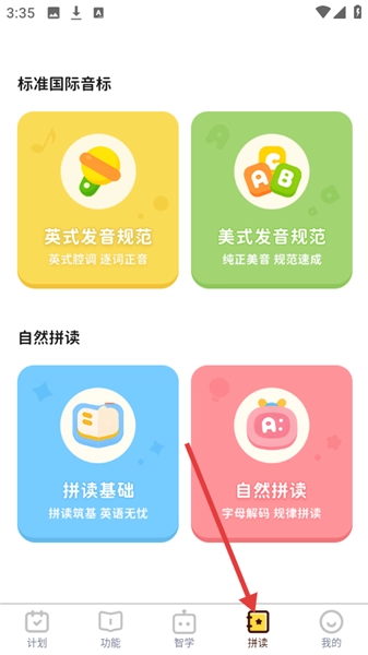 4、进入【拼读】页面,能够学习英式、美式发音的规范要求,还有自然拼读的拼读基础、字母解码等相关内容。
