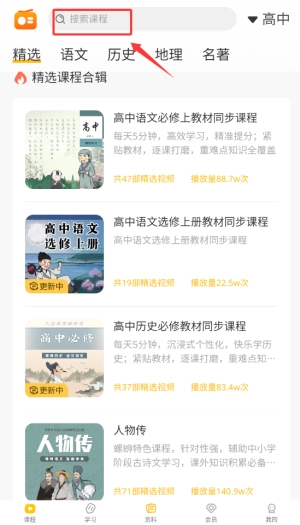 1、进入应用登录后,在首页顶部的搜索框中输入关键词,即可查找相关的语文课程。