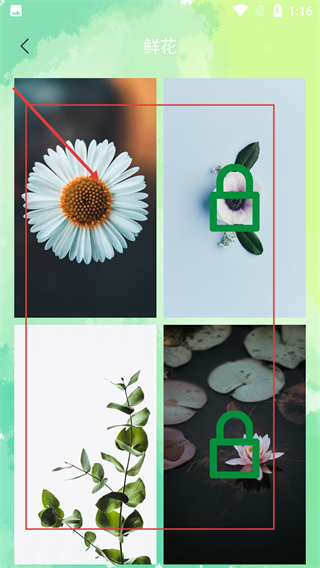 3、选择【鲜花】分类后,会展示该类别下的壁纸,其中部分壁纸带有锁形标识(需解锁),点击无锁的壁纸可查看详情。