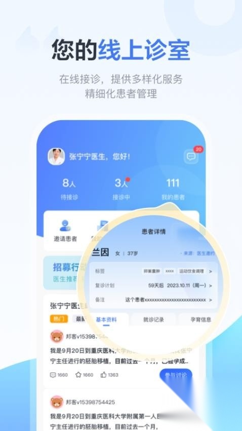 3. 医生能够搭建专属于自己的医患交流圈,完成复诊提醒、随访追踪以及内容的精准推送工作。