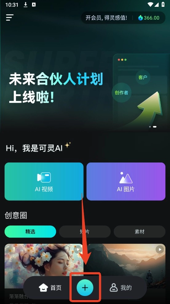 1、首先点击屏幕下方的加号,开始新建创作。