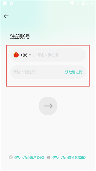 2、进入【注册账号】页面,在【请输入手机号】栏填写手机号,点击【获取验证码】按钮,待收到验证码后填入【请输入验证码】栏,就能完成手机号验证步骤。
