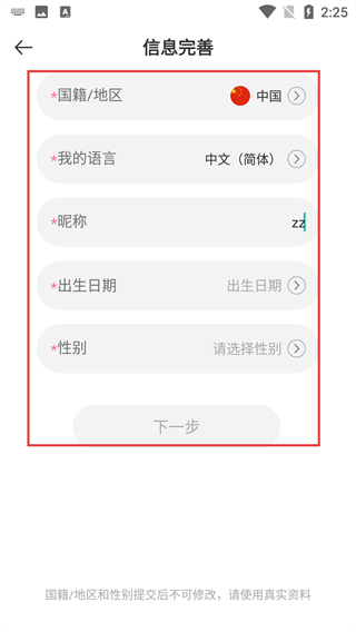 4、进入【信息完善】页面后,需要填写国籍/地区、语言、昵称等必填信息,确认信息无误后点击【下一步】,就能完成账号注册流程。