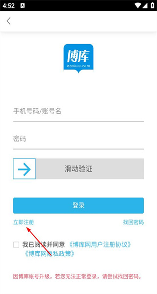 在登录界面,找到手机号账号输入框、密码输入框以及滑动验证区域后,点击“立即注册”选项。