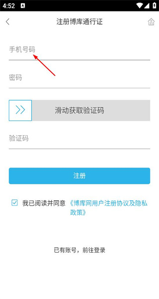 3、进入博库通行证注册页面,填写手机号,设置登录密码,勾选相关协议后点击注册按钮,即可完成账号注册流程。