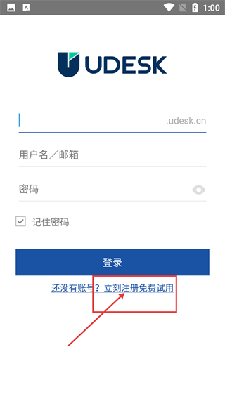 2、进入【UDESK】的登录页面,要是还没有账号,就可以点击【还没有账号?-立刻注册免费试用】这个选项,启动注册流程。