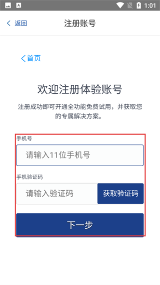 3、在注册页面填写【手机号】(要求为11位),获取并输入【手机验证码】后,点击【下一步】按钮继续完成注册流程。