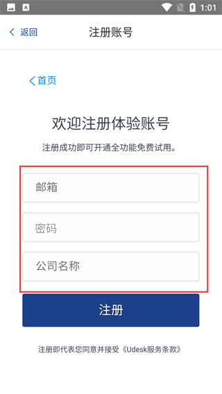 4、完成验证后,依次填写【邮箱】【密码】【公司名称】,点击【注册】按钮,就能开通【UDESK】全功能免费试用权限了。