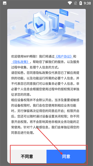 1、进入【WIFI畅联】应用后,需要先仔细阅读【用户协议】和【隐私政策】,在充分了解信息收集相关规则后,点击【同意】按钮方可进入应用。