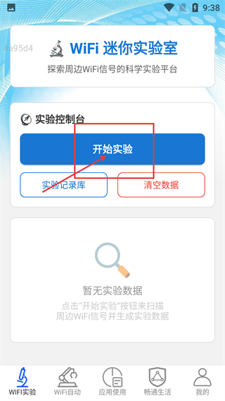2、进入【WiFi迷你实验室】主界面后,点击【开始实验】即可启动WiFi信号检测功能,另外还能通过【实验记录库】查看相关数据。
