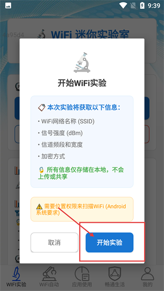 3、点击【开始实验】后,会弹出提示框说明将获取【WiFi网络名称-SSID】等信息,此时需要开启位置权限,之后再次点击【开始实验】来执行检测。