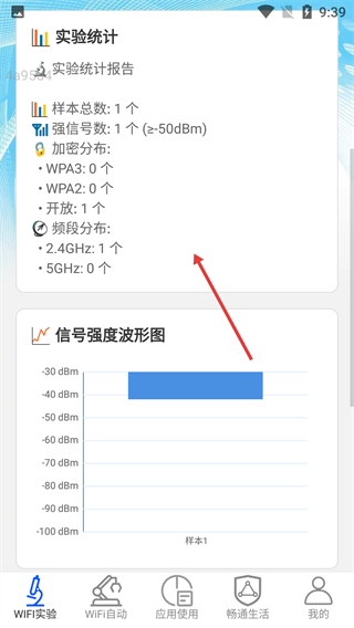 4、实验结束后,进入【实验统计】页面,能够查看【样本总数】【信号强度】等数据,也可以借助【信号强度波形图】直观地了解WiFi信号的状况。
