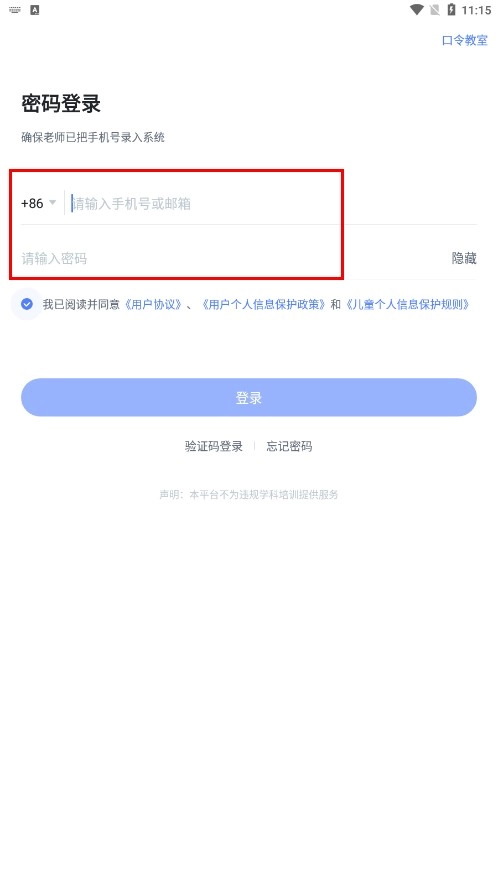 2、进入密码登录页面后,填写手机号或邮箱以及密码,勾选相关协议,随后点击登录按钮。