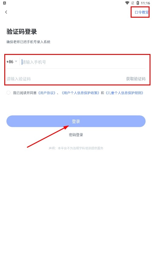 3、您也可以选择验证码登录方式:先填写手机号,接着获取并输入验证码,然后勾选相关协议,最后点击登录按钮完成操作。