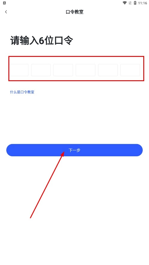 4、登录系统后,找到并点击【口令教室-功能入口】选项,接着在弹出的输入框中填写6位数字口令,确认无误后点击“下一步”按钮,即可进入对应的教室页面。