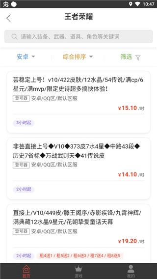 租号助手是个靠谱的账号租赁平台,用户既能在这里挑选各种优质游戏账号体验试玩,也能把自己闲置的账号租出去赚点收益。平台涵盖多款热门游戏,账号价值各有不同,操作起来安全有保障。使用时,用户要遵守平台的相关协议,保证账号信息真实有效。要是买家发现租到的账号和描述不一致(像段位、皮肤这些方面),平台会把租金退给买家。感兴趣的小伙伴可以来试试~
