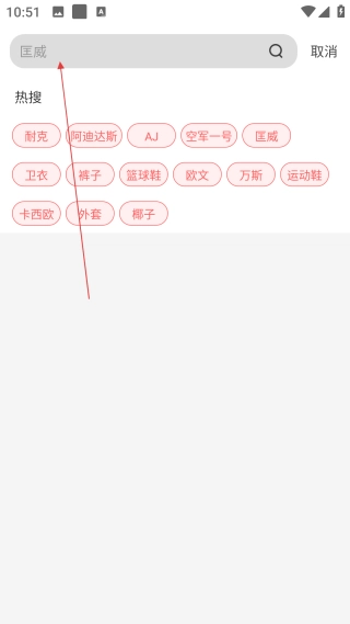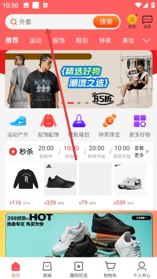 1、进入购物应用首页后,点击顶部【搜索】框,激活搜索功能准备输入内容。