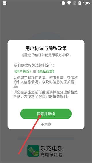 1、仔细阅读《用户协议》和《隐私政策》的条款内容后,点击【同意并继续】按钮,即可进入即乐充电乐的充电状态主界面。