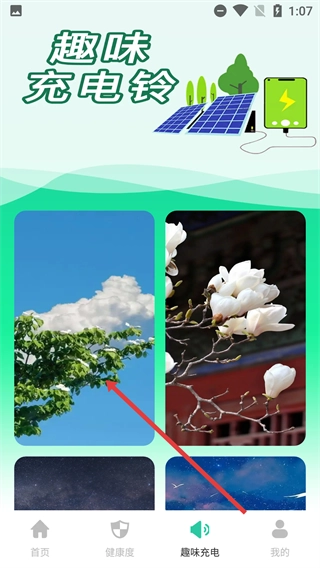2、当处于充电状态界面时,点击底部导航栏中的【趣味充电】选项,即可进入充电铃的选择功能页面。