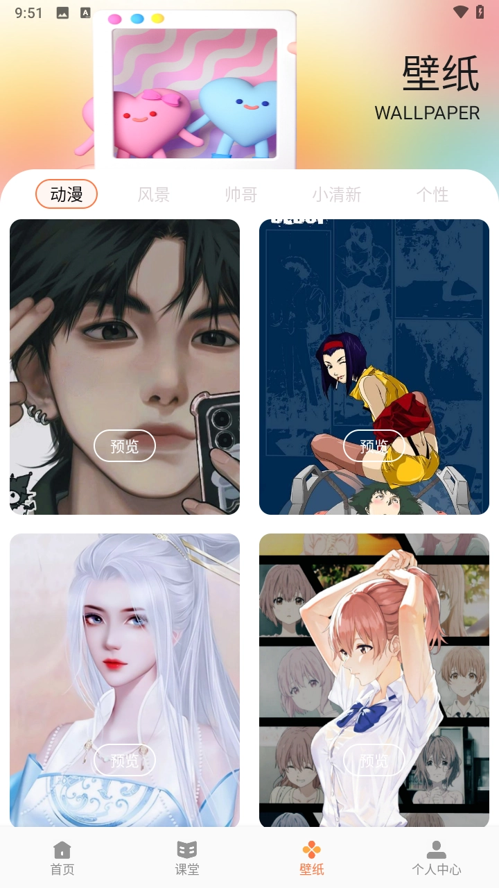 1、动漫、风景、个性、小清新等各类壁纸一应俱全,轻松就能找到心仪的主题。