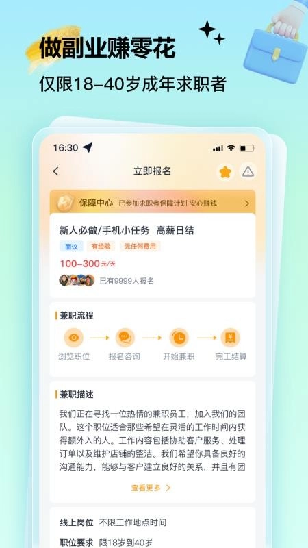 2. 平台上所有兼职工作资源均经过严格的真实认证流程,保证用户所接触的每一个岗位信息真实可靠,让大家在求职过程中更安心、更放心。