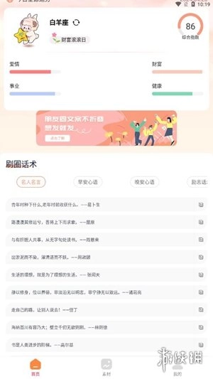 微圈图是一款专门为朋友圈设计的软件,拥有丰富的精美文案模板、高清配图以及贴心的话术资源库,还具备星座运势解析和个性分析的功能,能够帮助您快速生成高质量的朋友圈内容,并且支持一键复制转发,让您不再为文案发愁,社交分享变得更加高效和精彩,感兴趣的用户赶紧来体验吧。