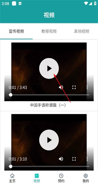 2、进入视频页面后,在宣传视频标签栏找到中国手语称谓篇视频,点击视频上的播放按钮,即可开始观看该视频内容。