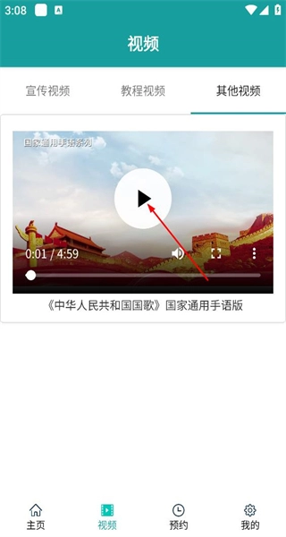 4、切换到其他视频标签页,找到国歌手语版视频后,点击该视频的播放按钮,观看这一不同类别的视频内容。