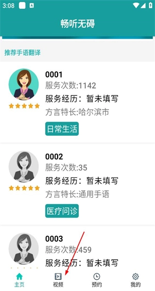 打开软件进入首页后,在推荐手语翻译人员列表处,点击底部的视频选项,即可进入涵盖多种视频类型的功能页面。