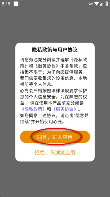 1、开启心光应用,在弹出的隐私窗口里点击“同意,进入应用”按钮。